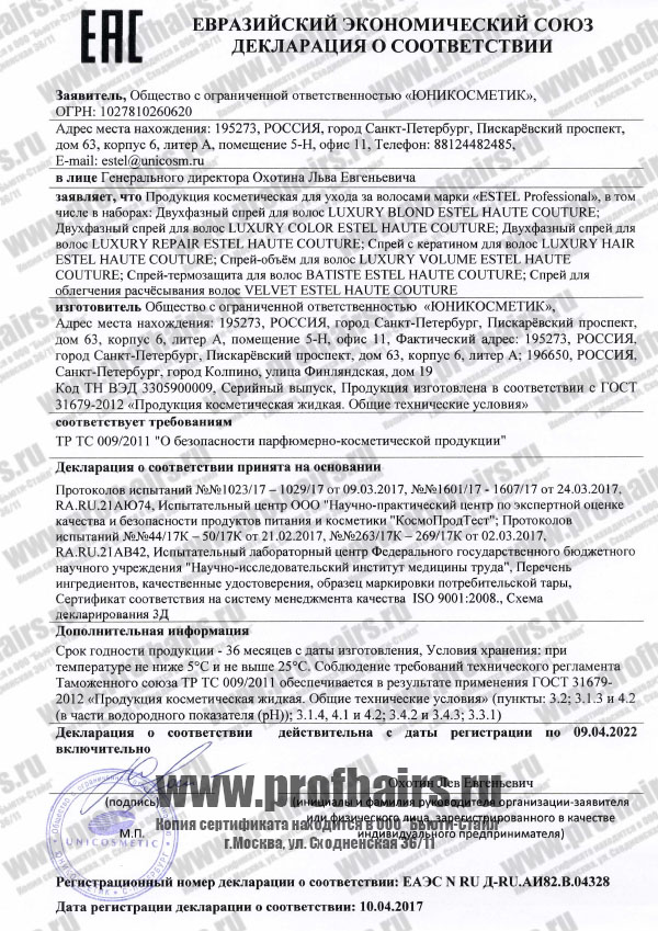Estel Haute Couture Спреи для волос. Декларация о соответствии.