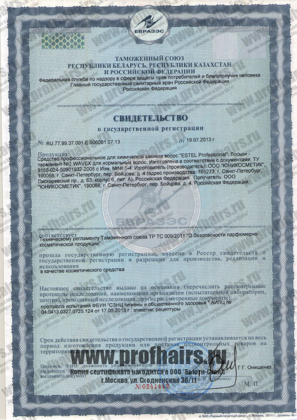 Свидетельство о регистрации средства для химической завивки нормальных волос Wavex №2 от Estel Professional.