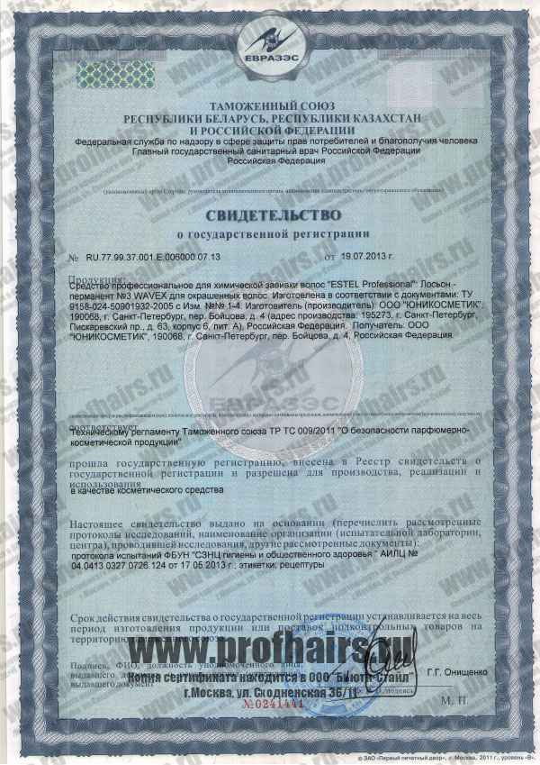 Свидетельство о регистрации средства для химической завивки окрашенных волос Wavex №3 от Estel Professional.