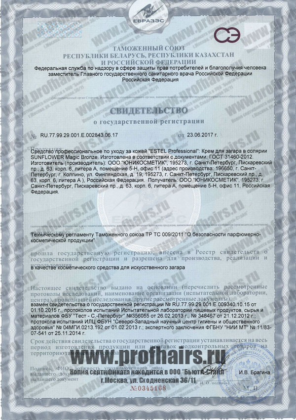 Estel SOL 2 Крем для загара с 5 бронзаторами Magic Bronze. Декларация о соответствии.