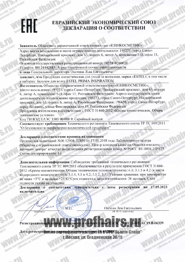 Estel Prima Inspiration Бальзам для волос. Декларация о соответствии.