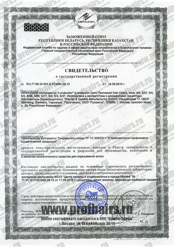 Свидетельство о государственной регистрации Londacolor Demi Permanent Hair Color Стойкая Интенсивное тонирование
