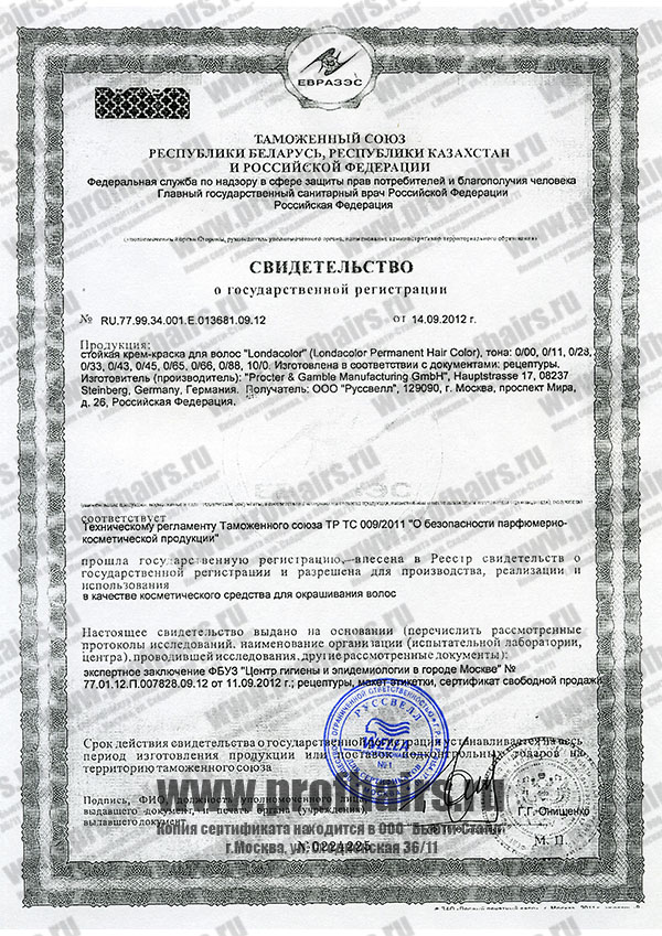 Свидетельство о государственной регистрации Londacolor Permanent Hair Color Стойкая крем-краска для волос