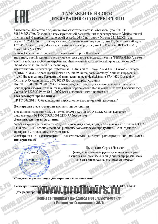 Декларация о соответствии Schwarzkopf Fibreplex №2 Bond Sealer Интенсивный ухаживающий крем для волос