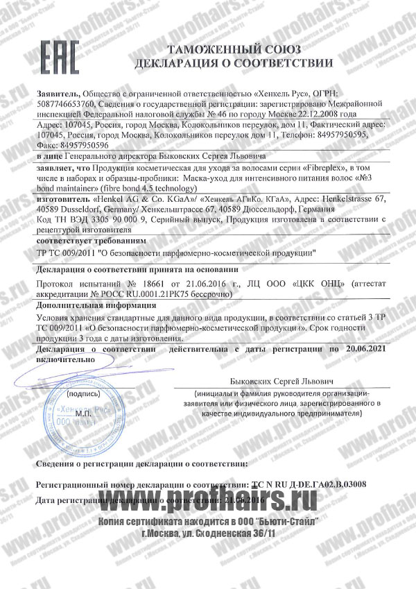 Декларация о соответствии Schwarzkopf Fibreplex #3 Bond Tainer Маска-уход для интенсивного питания волос