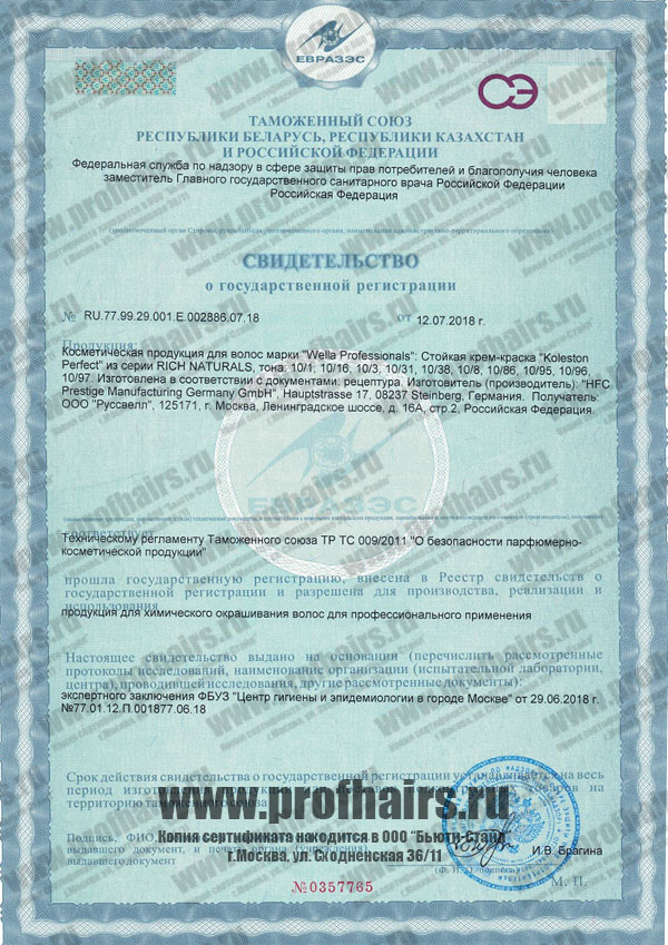 Декларация о соответствии. Крем-краски KP Rich Naturals 10: 10/1, 10/16, 10/3, 10/31, 10/38, 10/8, 10/86, 10/95, 10/96, 10/97