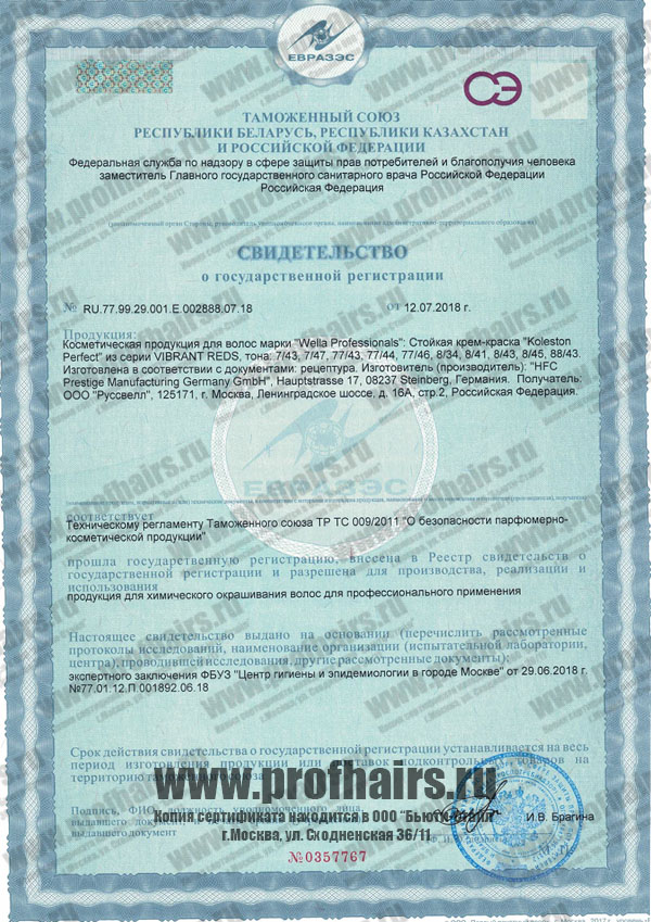 Декларация о соответствии. Крем-краски KP Vibrant Reds 7-8: 7/43, 7/47, 77/43, 77/44, 77/46, 8/34, 8/41, 8/43, 8/45, 88/43